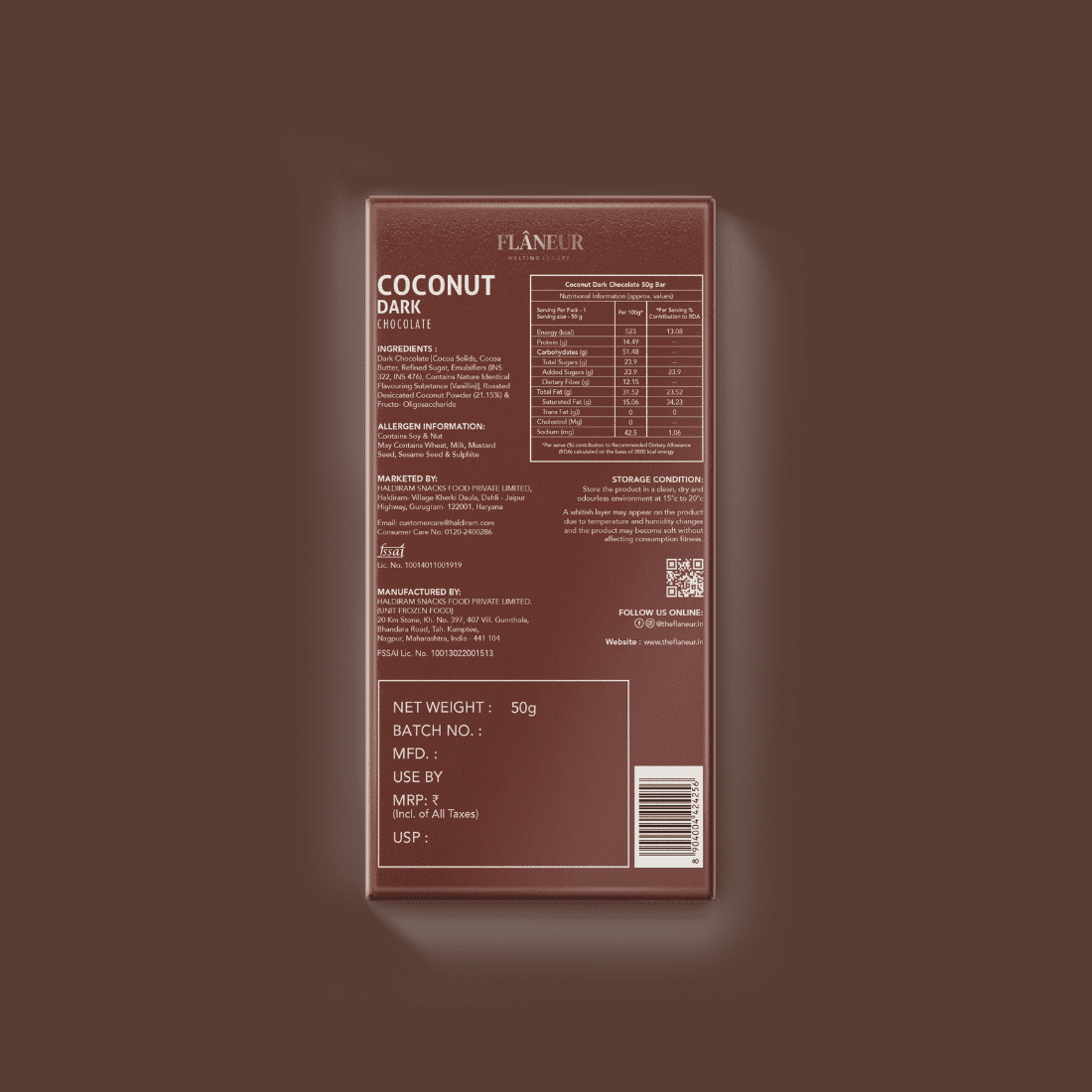 Crafted using premium dark chocolate, this bar delivers a deep, robust cocoa profile balanced by the creamy, aromatic notes of coconut. Every bite offers a smooth texture with subtle crunch, creating a harmonious contrast between bitterness and natural sweetness.