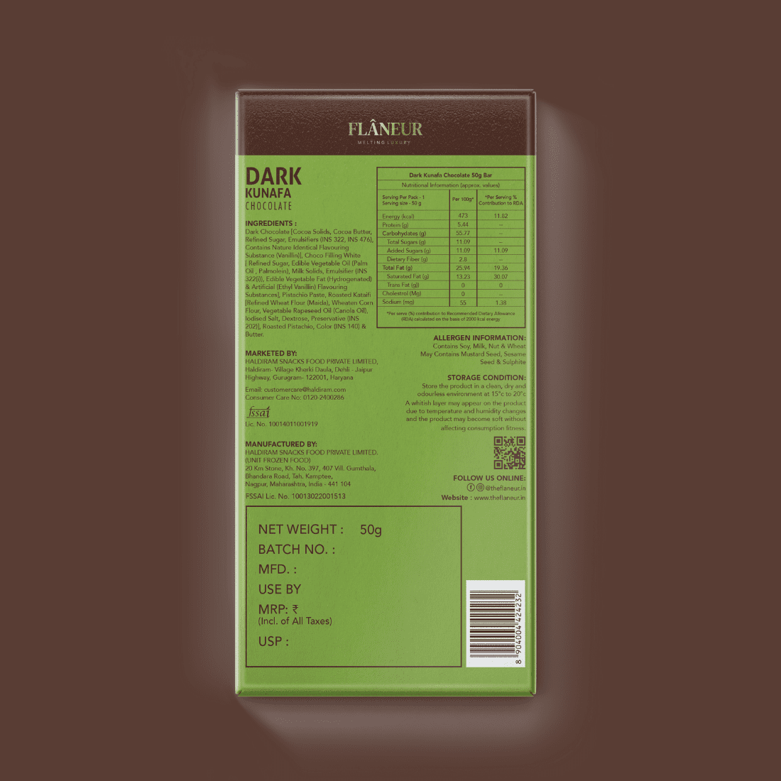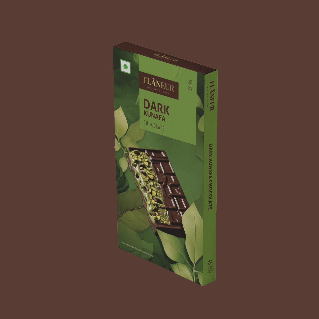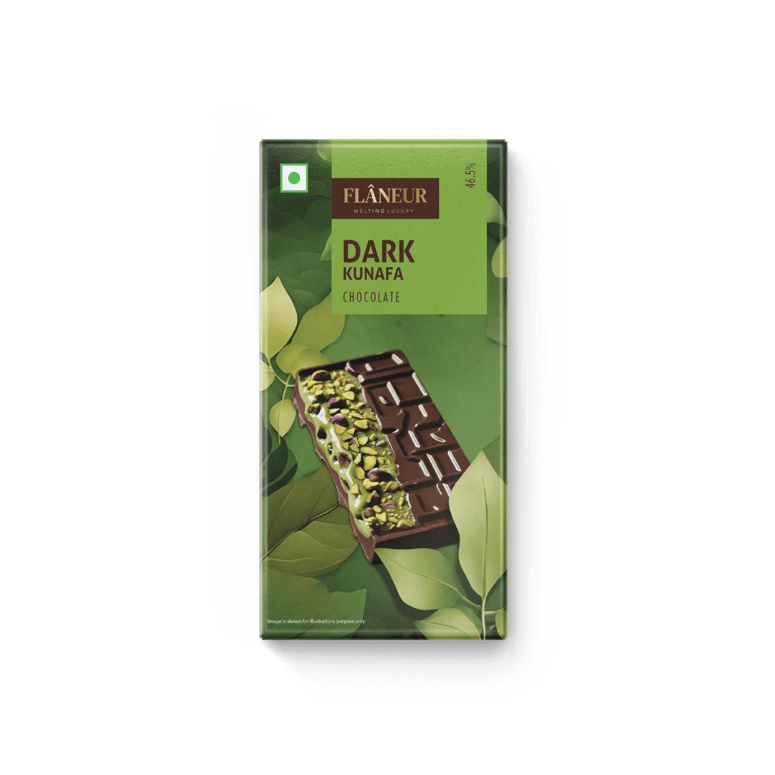 Experience indulgence redefined with Flaneur Dark Kunafa Chocolate where fine dark chocolate meets the timeless flavours of Middle Eastern kunafa.